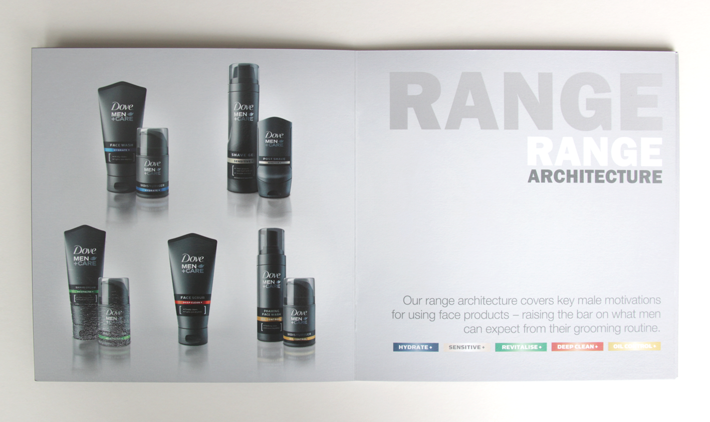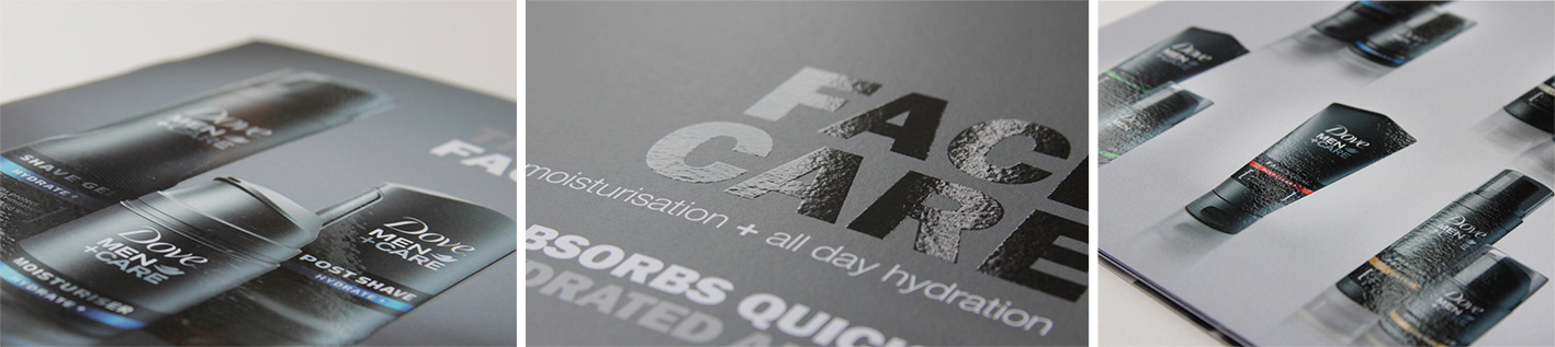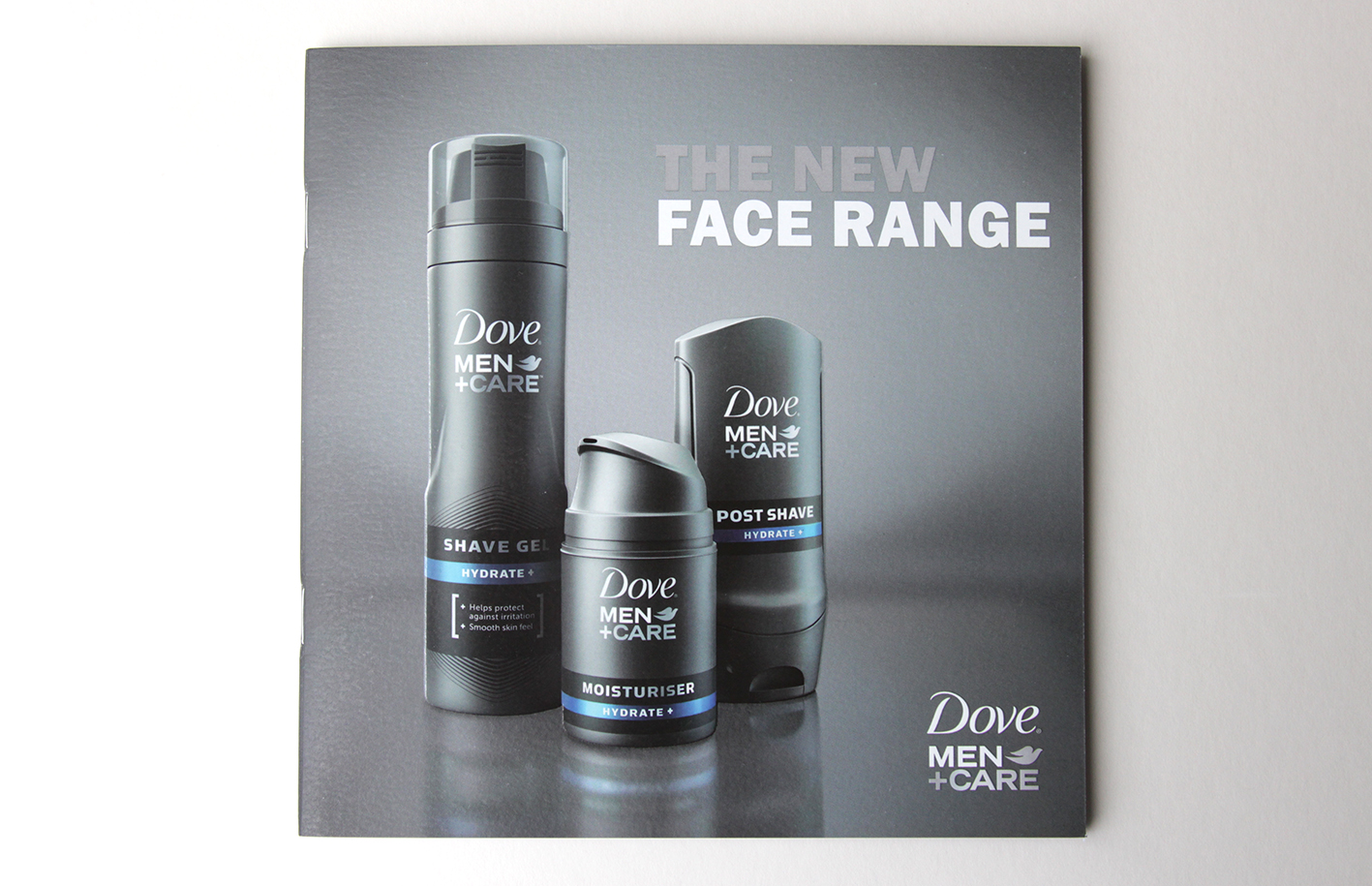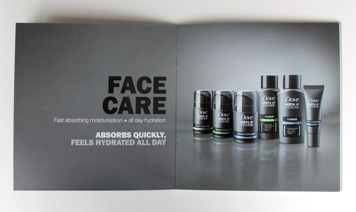 Brochure design for Dove Men+Care Face Care. To create a very premium look and feel a heavy, slightly structured paper was chosen and all headlines and products appear with a glossy finish.