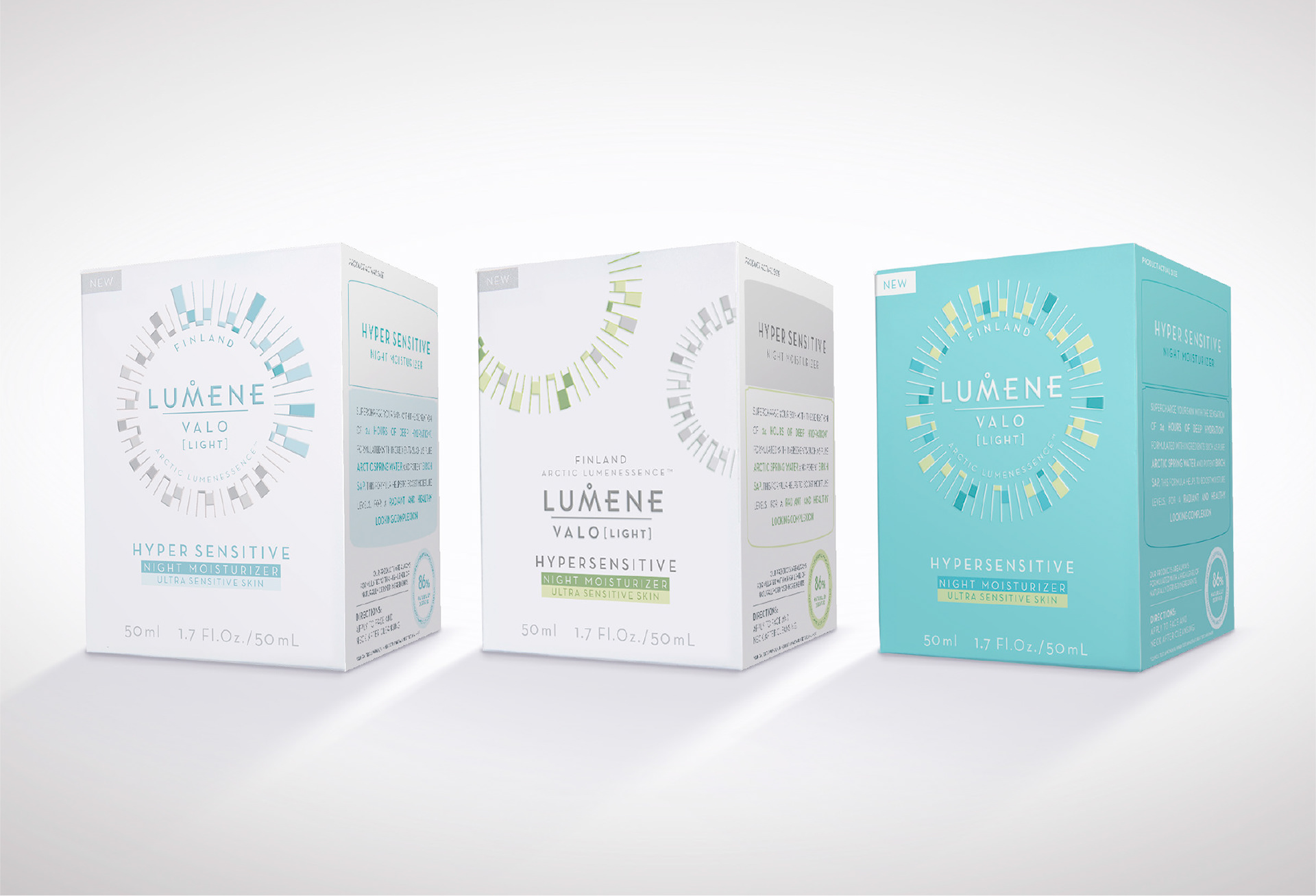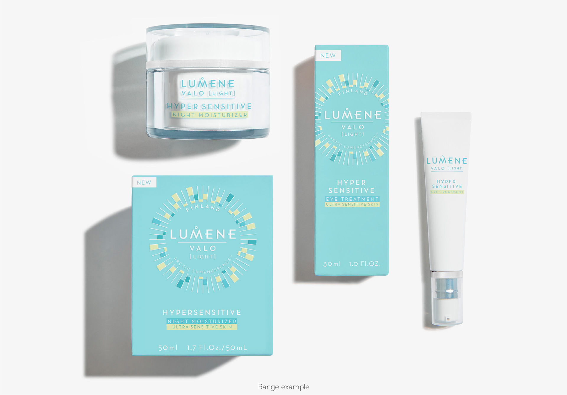 Packaging design for the Hypersensitive skin care range of the Nordic beauty brand Lumene.
